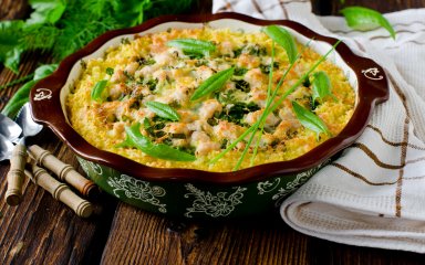 Гаряча і вершкова страва підкорить вас з першого ж шматочка. Шинка додає страві димності, сир — тягучості, а овочі — користі. І все це на фоні пшона — безглютенової крупи, багатої на мінеральні солі, залізо і вітаміни А і В.