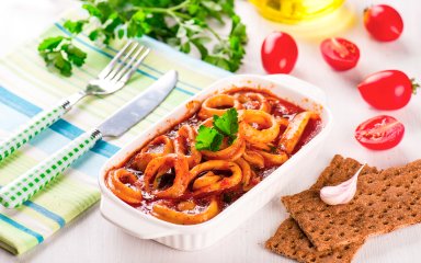 Незвичне поєднання — кальмари й білокачанна капуста разом в одній страві — дуже добре смакують. Капуста дає «приземлений» смак, а кальмари — пікантний. Довершує цей тандем томатна паста.
