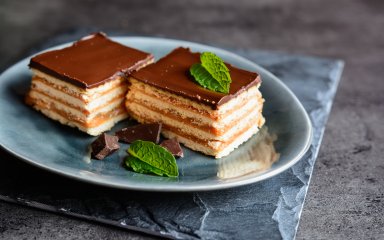 Деко застеліть пергаментом і викладіть на нього шари: пласт тіста — начинка. Закінчіть пластом тіста. Залиште постояти 30 хвилин. Потім випікайте в розігрітій до 190°C духовці 40 хвилин.
