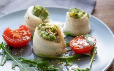 Підготовлену начинку покладіть на скибочки риби, згорніть їх рулетиками й обв’яжіть нитками. Обкачайте їх у борошні й обсмажте в маслі до золотистої скоринки з усіх боків.