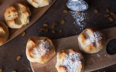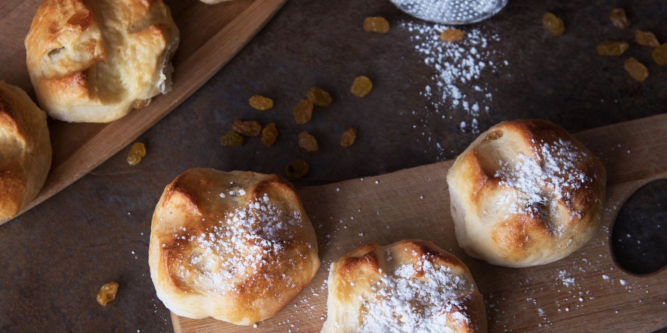 Зробіть на булочках по кілька надрізів і випікайте 20 хвилин при температурі 180°C. Готові булочки посипте цукровою пудрою.