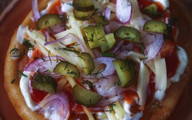 Печеться з дріжджового тісто, прикрашається улюбленими топінгами — обсмажені або мариновані овочі, будь-який сир, зелень.