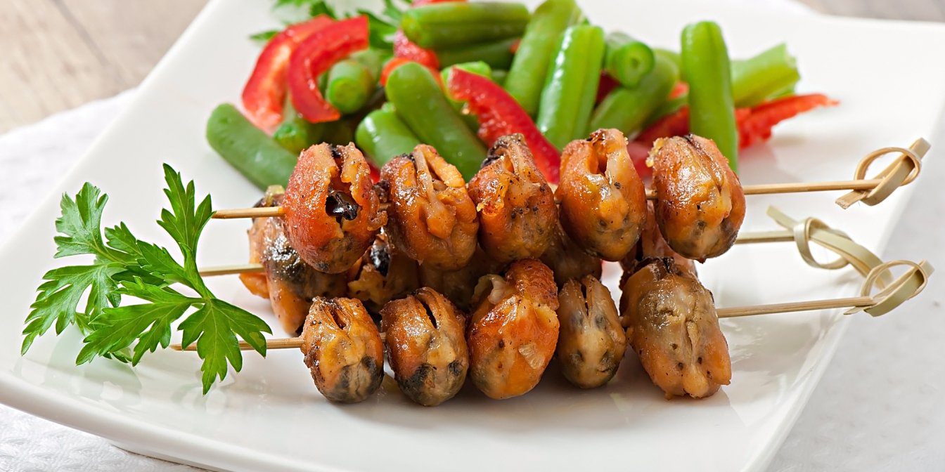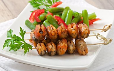 Шашлички з мідій підійдуть до овочевих страв, легких святкових столів, перекусів, фуршетів чи просто сімейної вечері. Подайте до страви коктейль Hugo, і прихильність гостей буде у вашій кишені.