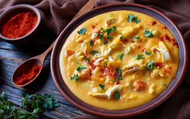 Підрум’янені шматочки індички, тушковані в гарбузовому пюре, — це смачна і соковита страва для вечері. Підсмажене біле м’ясо через свою низьку жирність частенько виходить сухим, але у цій страві завдяки пюре знайдено компроміс.