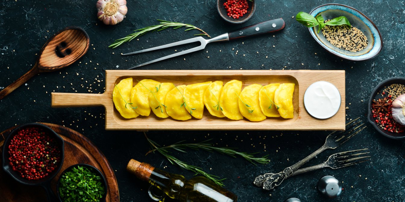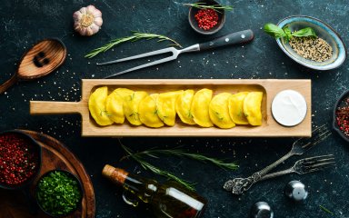 Жовті вареники — ще один різновид кольорової страви. І начинка незвична — солодкий пряний батат. Готувати такі вареники так само, як і традиційні. А от їсти — куди веселіше!