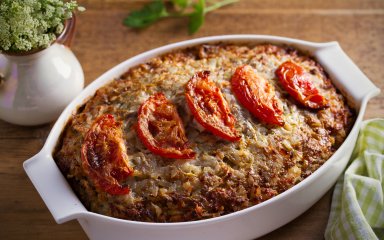Помістіть форму у духовку, розігріту до 180°C, на 50-60 хвилин до зарум’янення. Подавайте страву гарячою.