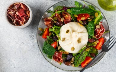 Найкращий спосіб насолодитися солодкою кислинкою помідорів та свіжістю зелені — це салати. Додайте до них прошуто з копченим смаком і вершкову бурату, щоб вийшло смачне і ситне поєднання.