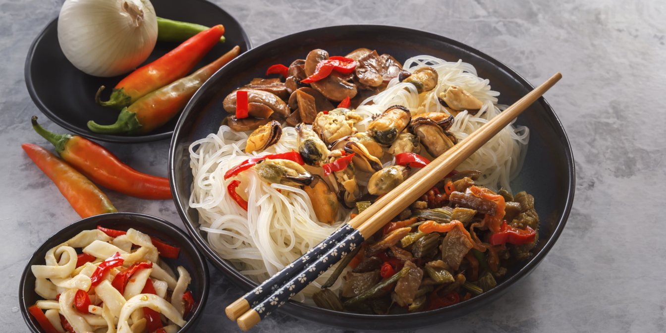 Поєднання морепродуктів і рисової локшини — це класика в азійських країнах. Справді, ці інгредієнти створені одне для одного і добре ладнають з іншими продуктами, особливо овочами та бобовими.
