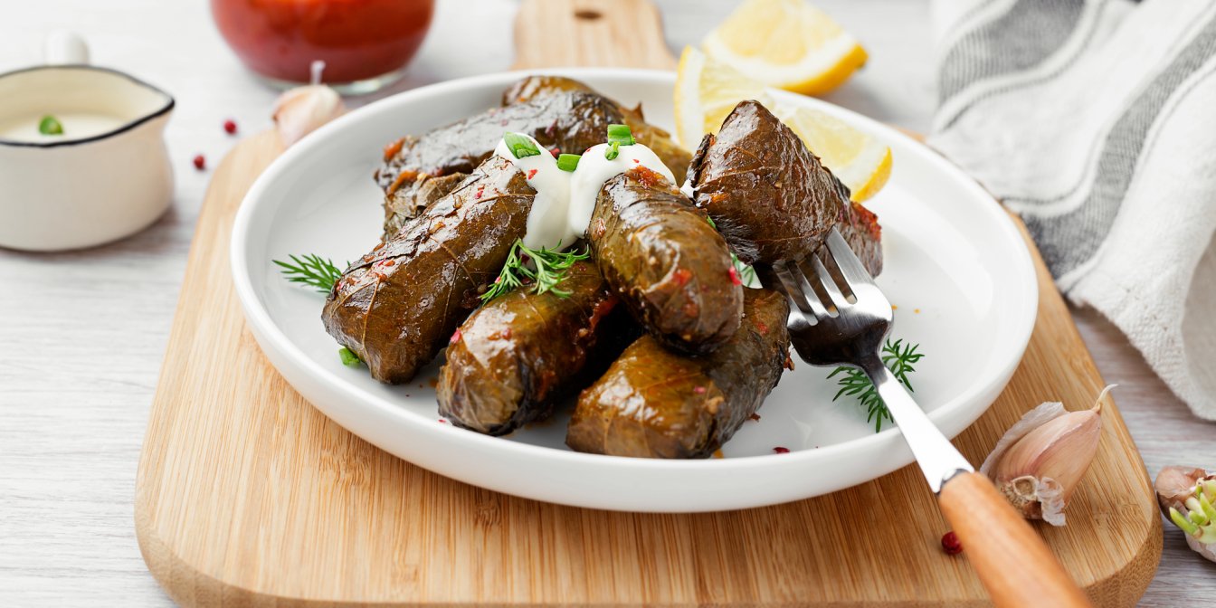 Долмадакья — це знамениті (і дуже смачні) грецькі голубці з виноградного листя, фаршированого м’ясом, рисом і овочами.