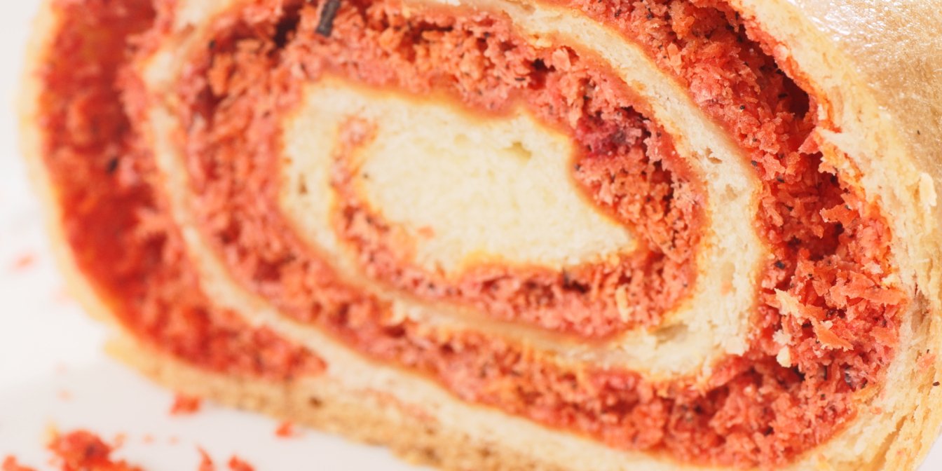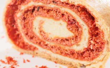 Особливістю цього рулета є червона начинка. Звичайно, можна додавати харчовий барвник, або ж використовувати природний. Більше про природні барвники ми писали раніше.