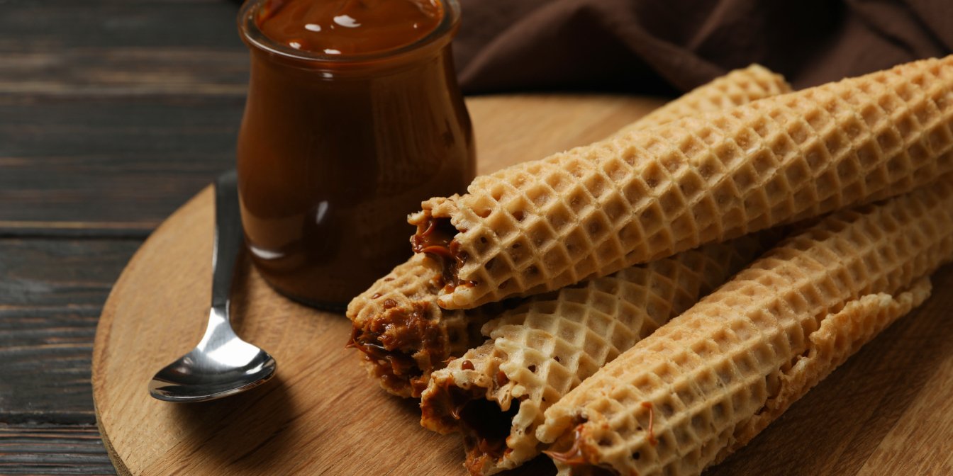 Вафельницю розігрійте і змастіть олією. Налийте 30 мл тіста і випікайте до золотистого кольору. Спечіть всі вафлі і зразу згортайте, поки вони гарячі.