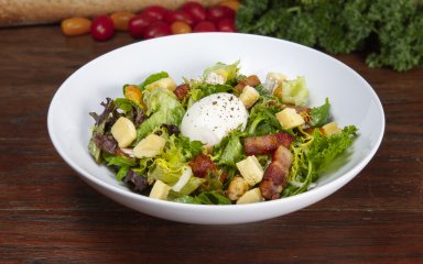 «Зберіть» салат. На дно миски складіть салат, обсмажений бекон та цибулю шалот, полийте заправкою — а зверху викладіть яйце. Насолоджуйтесь цим неймовірним поєднанням смаків!
