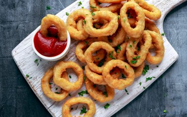 Обсмажуйте з двох боків до золотистої скоринки, приблизно по 2-3 хвилини з кожного боку. Готові кільця викладіть на паперовий рушник, щоб він усотав зайвий жир. Потім перекладіть на таріль і зразу подавайте до столу.