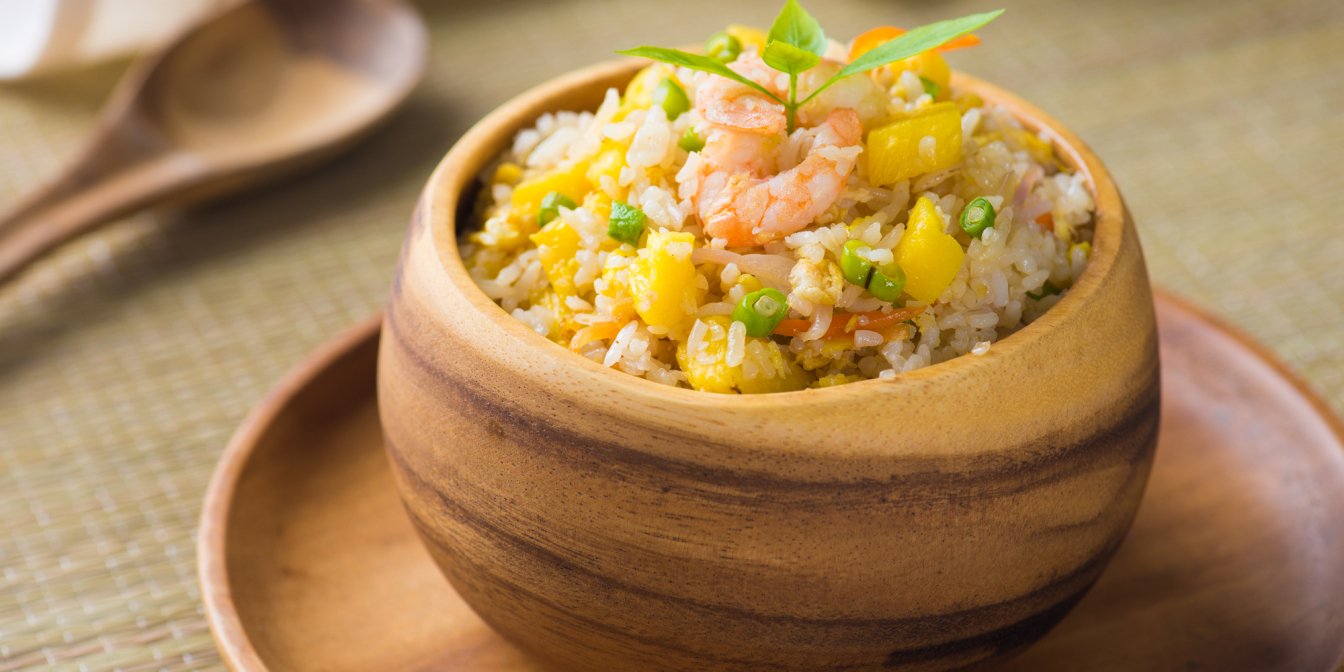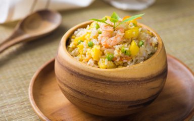 Салат з ананасами, креветками та рисом свіжий і ніжний і, крім основних інгредієнтів, містить консервовані горошок і кукурудзу, солодкий перець, салатний лист і приправи.