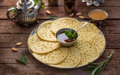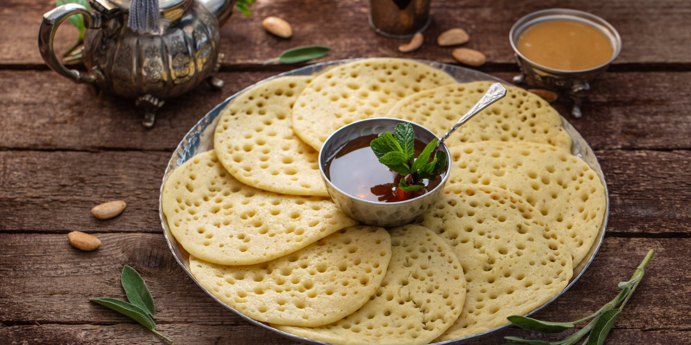 Марокканські пористі млинці багрір з манної крупи можна їсти з медом чи желе і запивати міцною кавою.