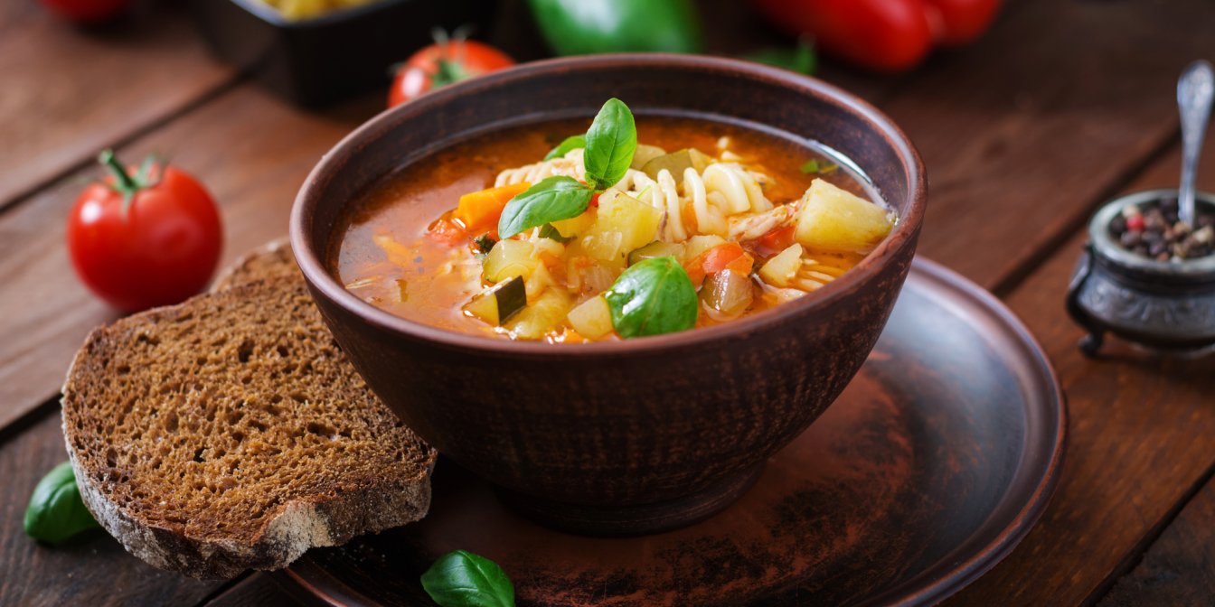 Пісний мінестроне зі стручковою квасолею з великою кількістю помідорів, цукіні, болгарського перцю та іншими овочами обов’язково подавати з хрумким часниковим багетом.