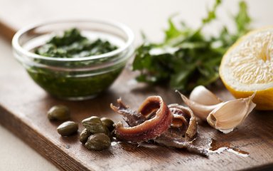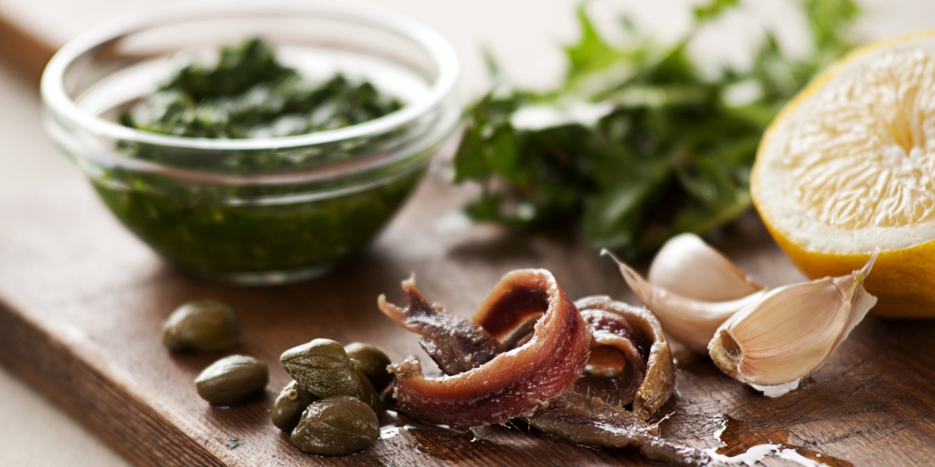 Подрібніть часник і дрібно наріжте петрушку. На дно миски покладіть філе в’ялених анчоусів і каперси, а потім подавіть їх тильною стороною ложки, поки вони не перетворяться на пастоподібну суміш.