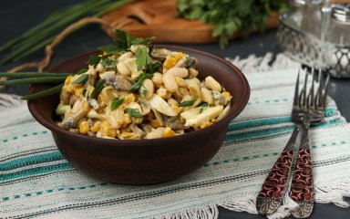 Ситний, смачний і ароматний — це салат з квасолею, кукурудзою і грибами. Додавання улюбленого сиру і яєць значно урізноманітнює його смак. А ще такий салат може стати святковою стравою, наприклад, на Великдень.
