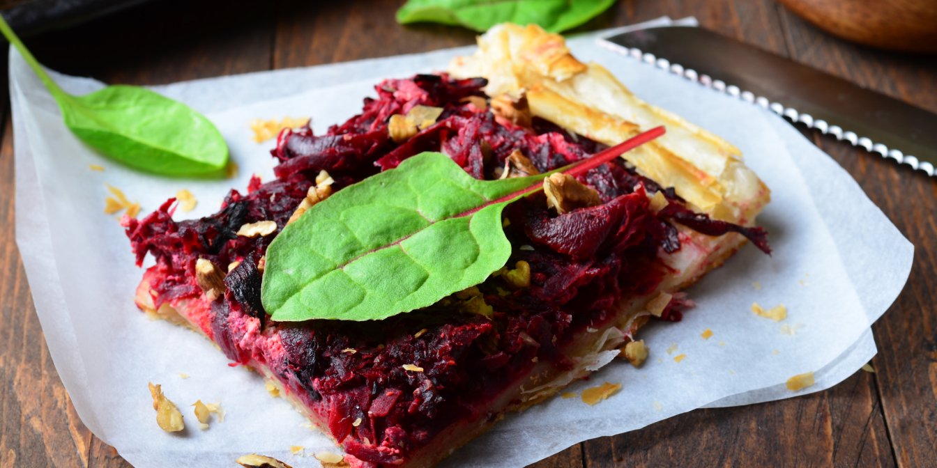 На добре присипаній борошном поверхні розкачайте тісто завтовшки 0,5 см і виріжте коло такого ж розміру, як ваша сковорода. Обережно дістаньте форму з духовки, зніміть фольгу перемішайте і розрівняйте буряки та цибулю в сковороді, щоб вийшов щільний шар. Покладіть зверху тісто, підгорніть його трішки вниз по краях, щоб сформувати бортики, потім поверніть сковороду в духовку і випікайте протягом 35 хвилин або доки тісто не стане золотисто-коричневим.