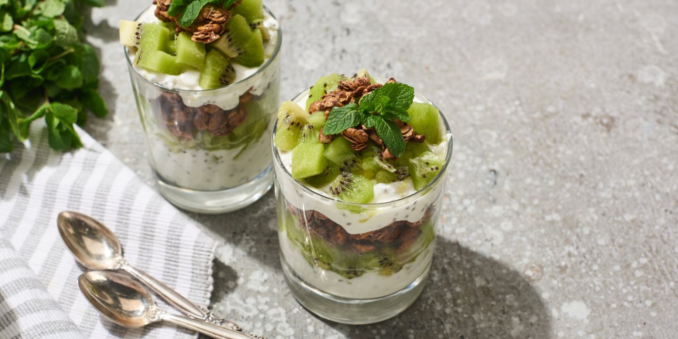 Цей десерт у склянці — ідеальне поєднання крихкого бісквітного печива, оксамитних збитих вершків, барвистих сухофруктів і свіжих ківі.