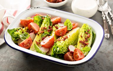 SHUBA радить вибрати для салату молоду пекінську капусту та обережно відрізати саме її зелену частину. Помідори краще вибрати чері — вони солодкі та добре гармонують зі смаком капусти. Редиска додасть салату ще більше вітамінів.