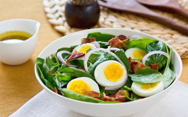 Покладіть слайси бекону в сковороду та підсмажте до золотистого кольору. Дайте охолонути та наріжте на дрібні шматочки. Додайте бекон у миску зі шпинатом та цибулею, додайте кілька столових ложок йогурту та дрібно порізаний або пропущений через прес часник. Прикрасьте нарізаним яйцем, посоліть і поперчіть за потреби й подавайте.