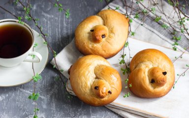 Великодні «курчата» з ароматною скоринкою та м’якою серцевинкою готуються з тіста на основі борошна, молока, дріжджів і цукру. Готувати їх просто й весело. Ви навіть можете запропонувати дітям долучитися і зробити пташкам «очі» з горішків.