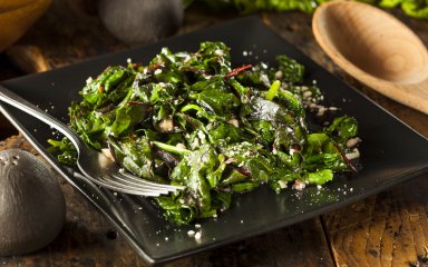 Цей салат легко приготувати, і він стане новим фаворитом у вашій родині. Сюди додаються родзинки для солодощів та сир пармезан для солоності. Але ви можете взяти улюблений сир і замість родзинок — курагу. Також спробуйте приготувати мангольд як гарнір з насінням коріандру.