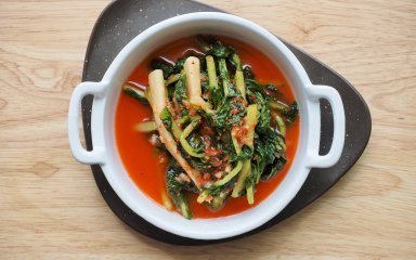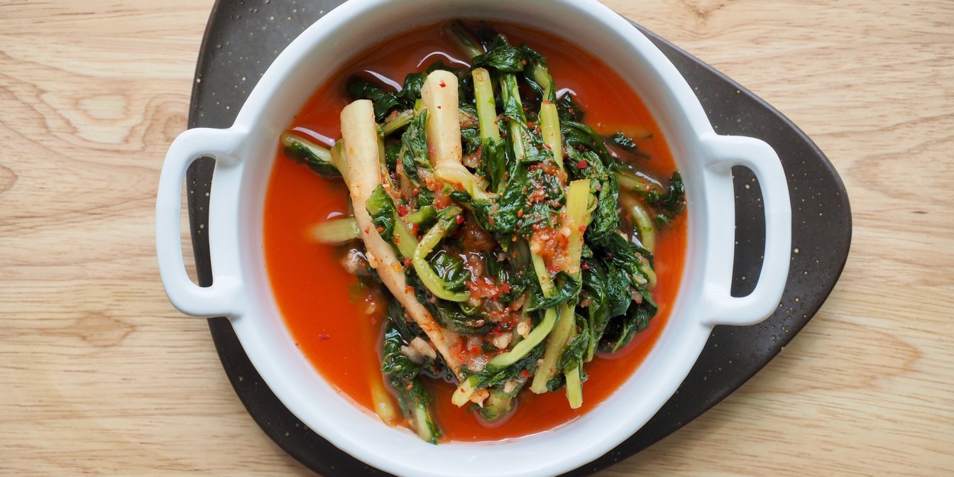 Цей сезонний кімчі готується з молодої хрусткої зелені редиски й капусти. Якщо зелень редиски (yeolmu) привносить до страви трохи перчинки та гостроти, то капуста (eolgari baechu) додає приємну контрастну солодкість.