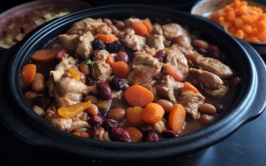 Викладіть в тажин (або іншу зручну каструлю) квасолю, лук, моркву й індичку.