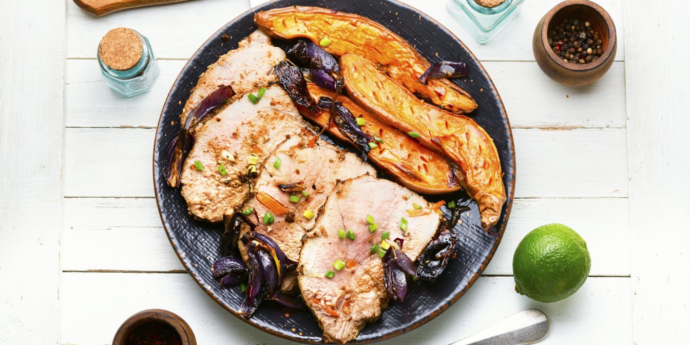Сухе маринування у спеціях робить свинячу лопатку ніжною та смачною, з приємним солодким ароматом. У супроводі гарніру із запеченого гарбуза і селери, які добре поєднується з ніжним смаком свинини, ця страва здобуває собі додаткові бали.