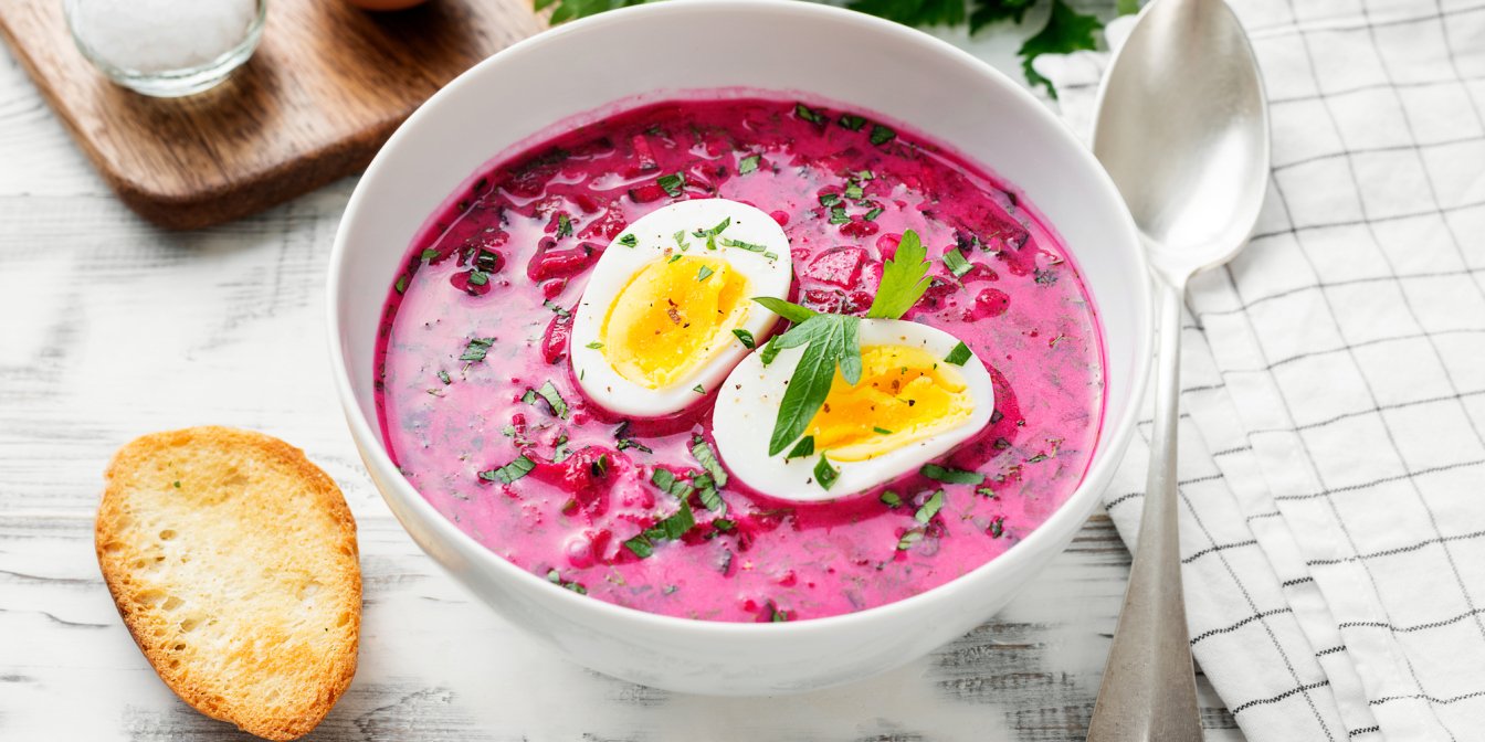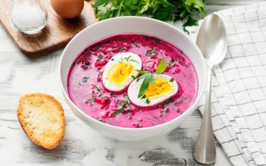 Суп з бурякової гички — це холодна перша страва, приготована з зелені, овочів, яєць і філе судака.