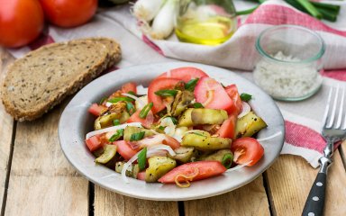 Салат з баклажанів і помідорів — найкраща пара до шашлику. Він ситний і добре насичує, але при цьому не перебиває смак м’яса. Овочі можна приготувати як вдома на сковороді-гриль, так і на грилі, мангалі чи барбекю.