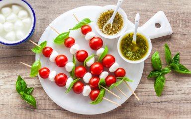 Різноколірні шашлички-капрезе — смачний італійський привіт до нашого столу. Яскраві й апетитні — вони легко піднімуть настрій всім учасникам застілля.