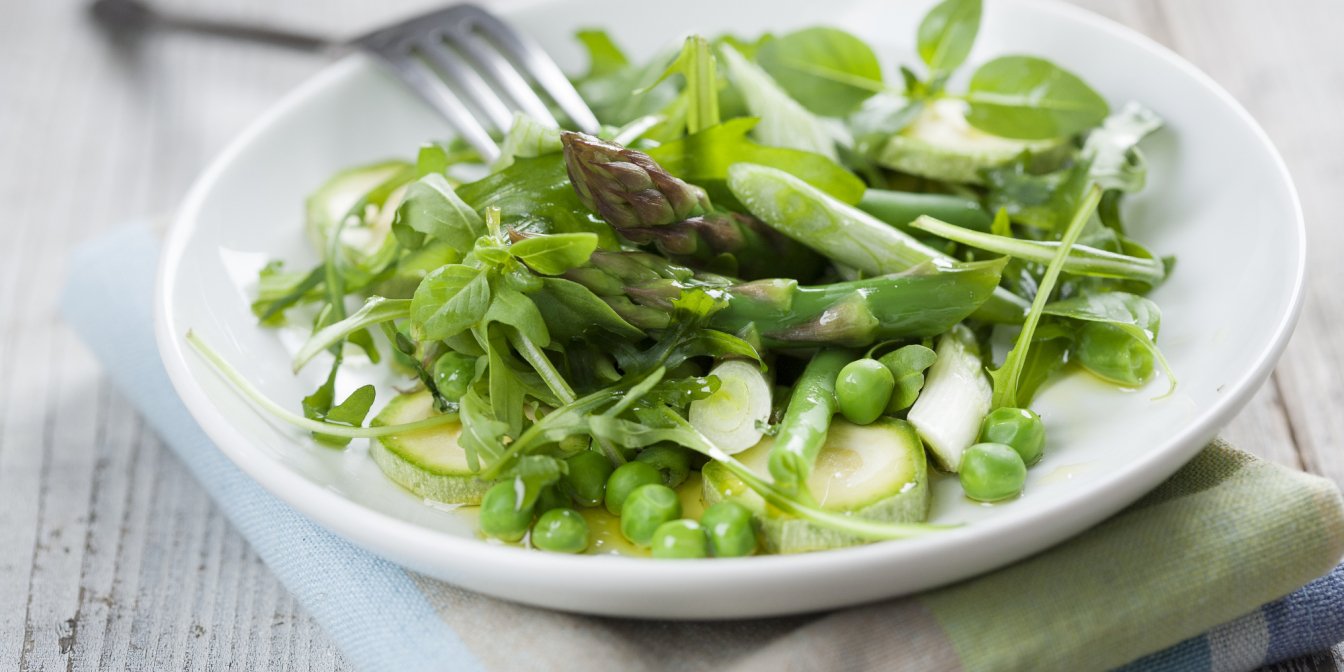 Весняна спаржа та гостра рукола в цьому салаті смачно доповнюються кабачком і молодим горохом, а згори прикрашені хрусткими панірувальними сухарями та смачною заправкою.