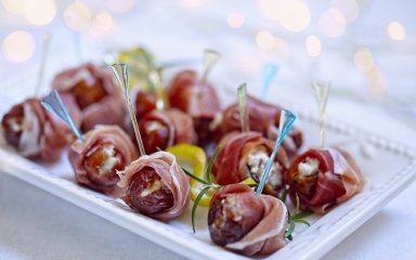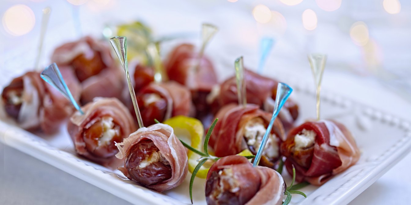 Солодкі фініки та солоне прошуто — безпрограшне поєднання! Додайте трохи маскарпоне та козячого сиру, і ви отримаєте швидку, але вишукану закуску для великої компанії.