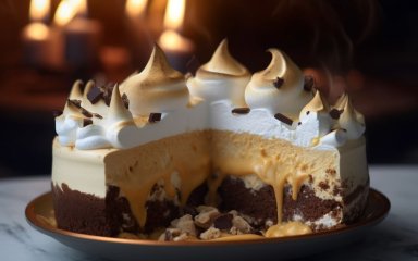 Складаємо торт: викладіть кремову масу на дно випеченого коржа, вкрийте масу спеченою меренгою і полийте шоколадним топінгом. Перед подачею охолодіть торт в холодильнику протягом 2 годин. Смачного!