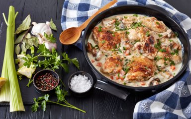 Цікаво, що страви, які спочатку обсмажуються, а потім тушкуються, зустрічаються у французькій кулінарній книзі Le Viandier (1300 р.). Вже у друкованому виданні книги, датованому 1490 роком, згадується саме назва friquassee. Чому б не спробувати повторити на своїй кухні одну з найбільш відомих страв французької кухні?