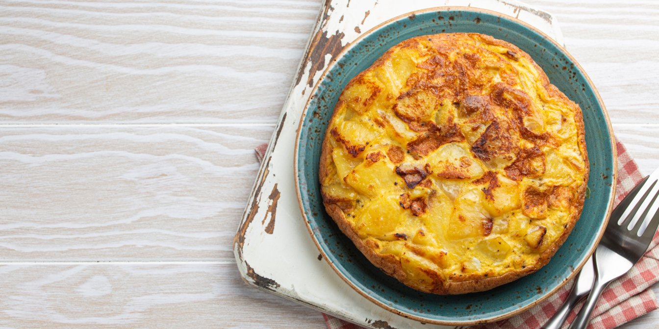 Зіркою страви є плантани, викладені на верхню частину фритати. Вам треба присмажити їх на сковороді, доки вони не стануть хрусткими та карамелізованими. Безпосередньо перед тим, як поставити фритату в духовку, викладіть зверху нарізані плантани. Поєднання пряних яєць та солодких бананів просто вражаюче! Доповніть страву нарізаним скибочками авокадо та краплею гострого соусу.