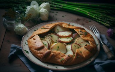 Тісто для галети готувати досить легко з масла, води й борошна. Для начинки використовуйте відварену картоплю і спаржу. Але можна додати й свої улюблені овочі, наприклад, кабачки чи зелений горошок. Також спробуйте тарт зі спаржею і беконом.
