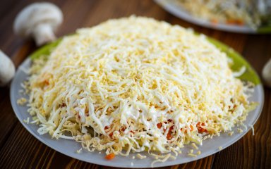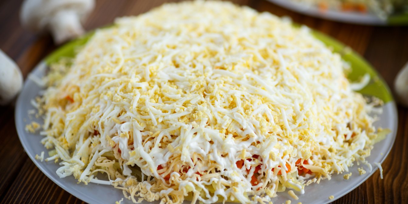 Яйця натріть на грубій тертці та рівномірно насипте поверх цибулі з грибами. Полийте майонезом.