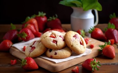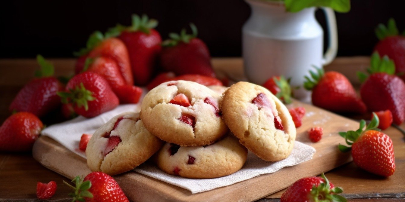 Барвиста випічка із золотистою скоринкою, яка приховує злегка вологу і м’яку серединку, тане в роті. Щоб зробити печиво з полуницею ще смачнішим, ви можете додати шматочки білого шоколаду або покрити їх глазур’ю з лимона або темного шоколаду.