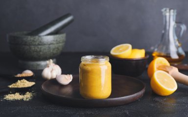 Часник почистити, подрібнити ножем або пропустити через прес. Перекласти в банку, вичавити сік із половинки лимона.