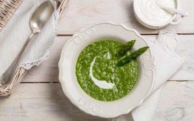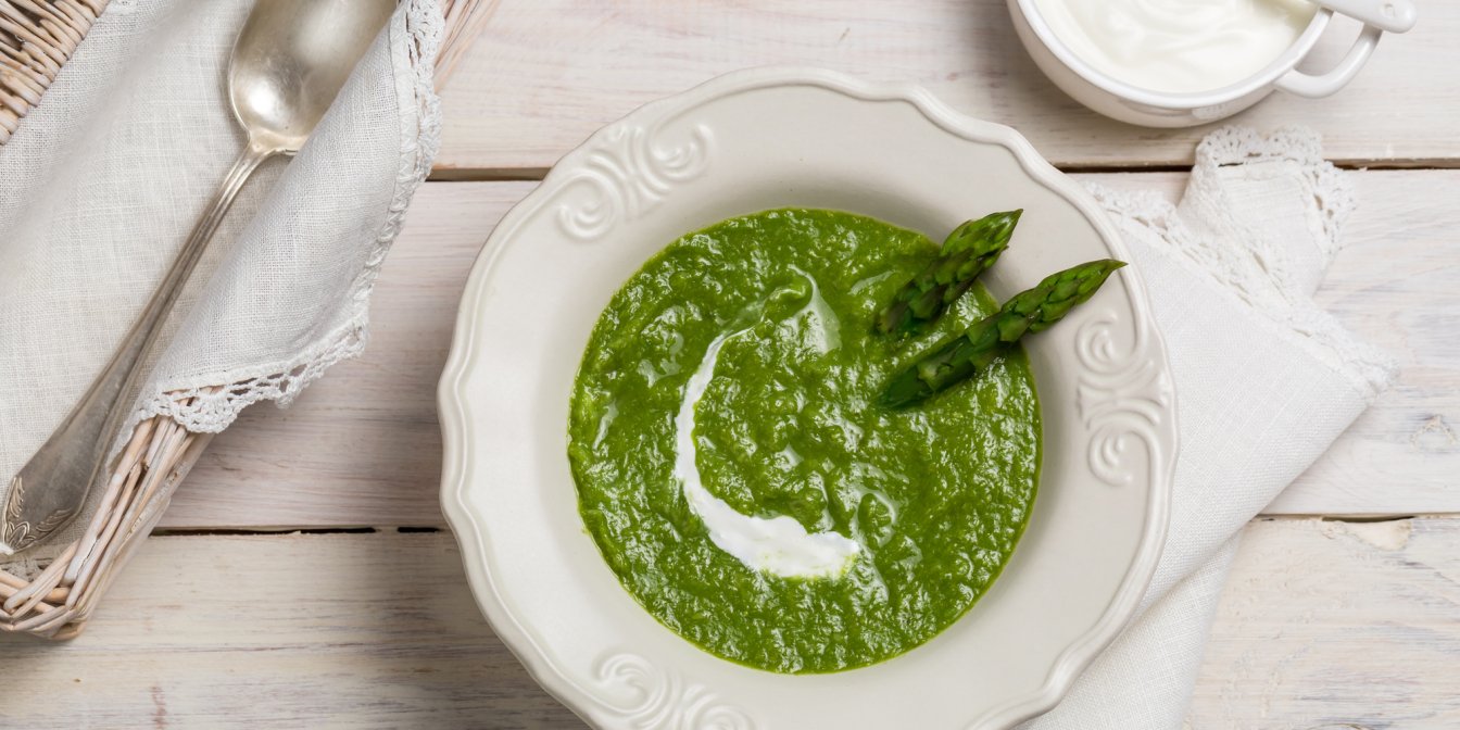 Густий і обволікальний суп-пюре зі спаржі — це корисна перша страва з легким весняно-літнім смаком.