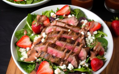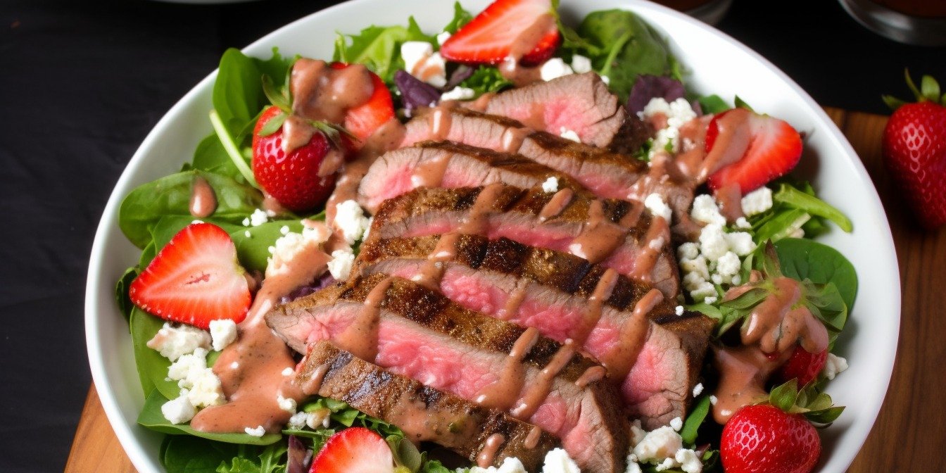 Салат зі стейком під полуничним соусом — це елегантна та смачна страва, у якій поєднуються соковитий стейк зі свіжим зеленим листям, спаржею, фетою та ароматним полуничним соусом.