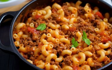 У цьому рецепті м’ясо тушкується в одній сковороді з гарніром — макаронами. Так вони просочуються томатно-яловичим бульйоном і стають неймовірно смачними. Порція сиру, розплавлена наприкінці, закріплює смак.