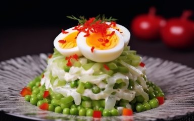 Салат із зеленого горошку, яблук та яєць — доволі ситна хоч і низькокалорійна страва. Заправляється такий салат не майонезом, а сметаною.