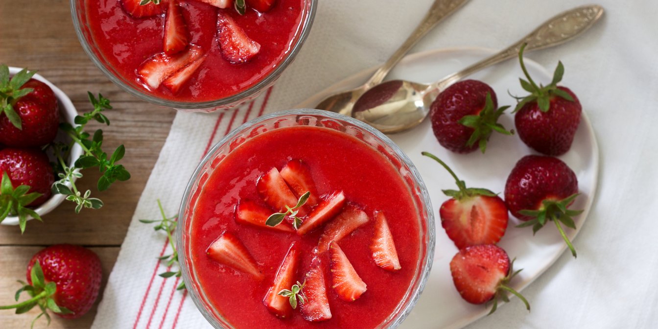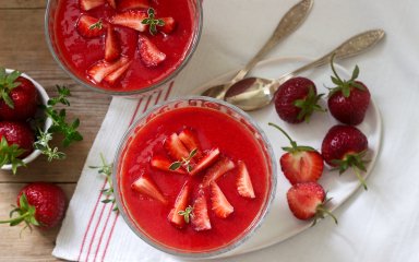 Решту полуниці розкладіть у бокали або креманки. Залийте їх полуничною сумішшю і залиште, щоб охолонула.