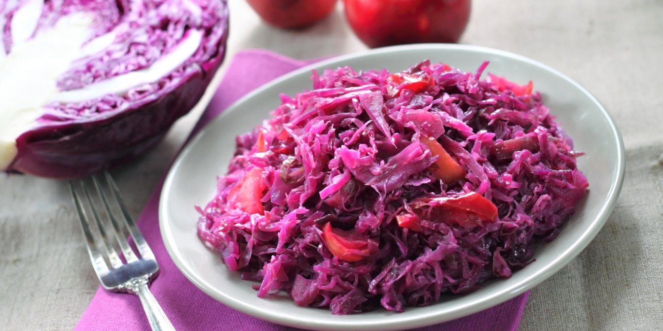 Солодка червона капуста, тушкована з яблуками та родзинками