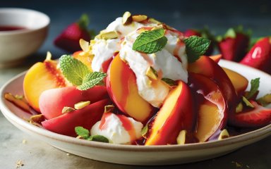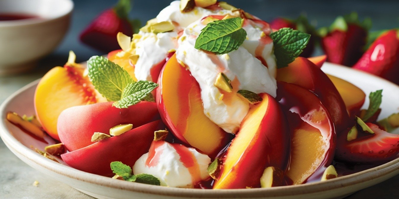 Фруктово-ягідний салат легкий, свіжий і корисний, але порція збитих з ванільним цукром вершків робить його не таким уже дієтичним, однак смачнезним. Ми вважаємо, що салат з полуницею і персиками — прекрасний додаток до вашого літнього меню.